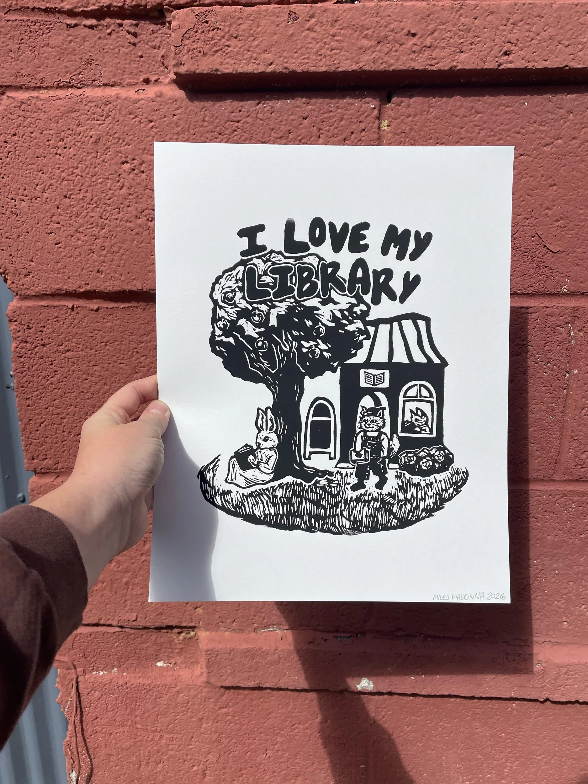 Hand carved illustration of a cute community of animals supporting their local library. Printed on 11×14 inch heavyweight print paper. Print quality varies, prints may have minor imperfections as a result of the printmaking process. Each print is unique.