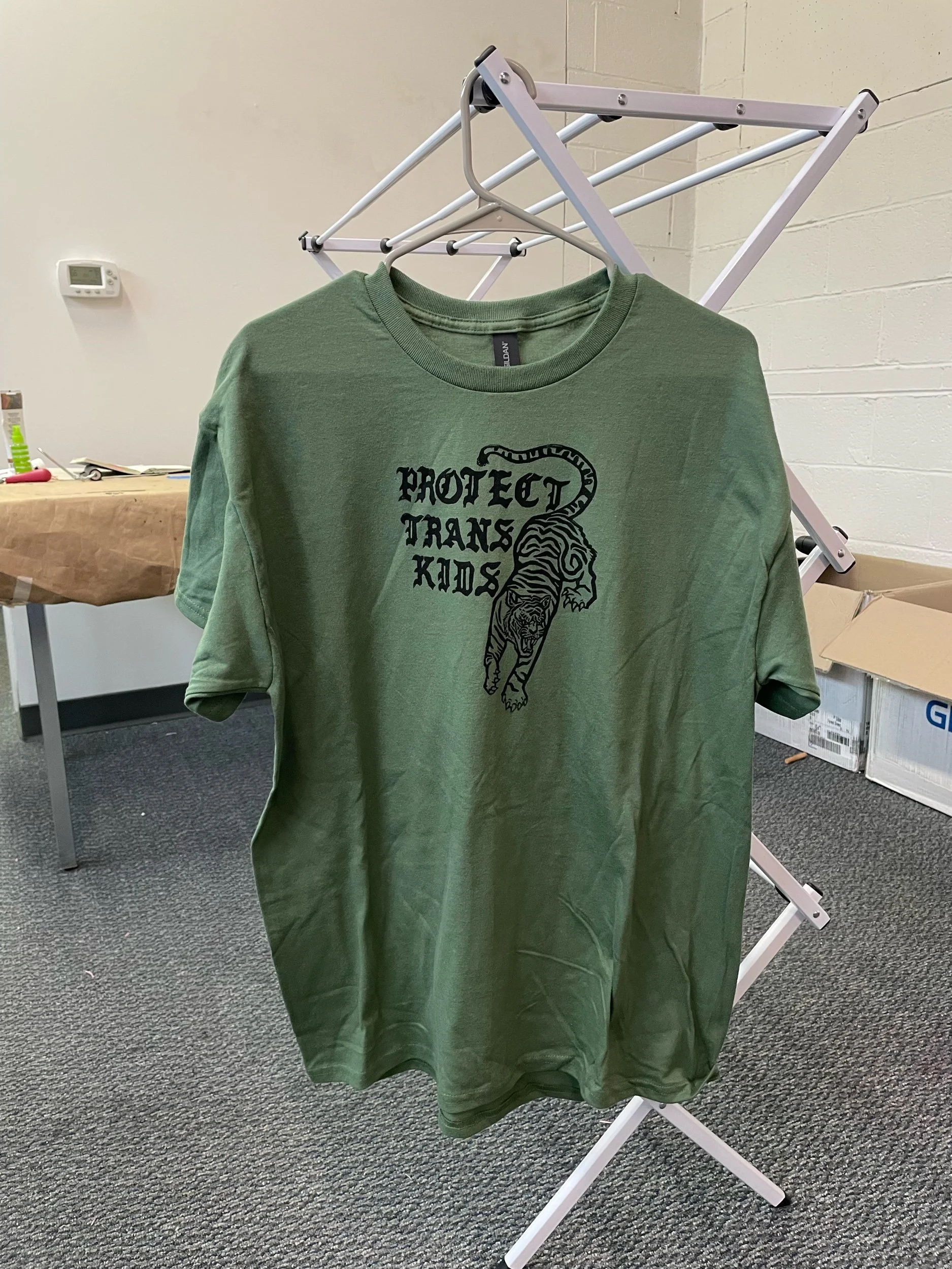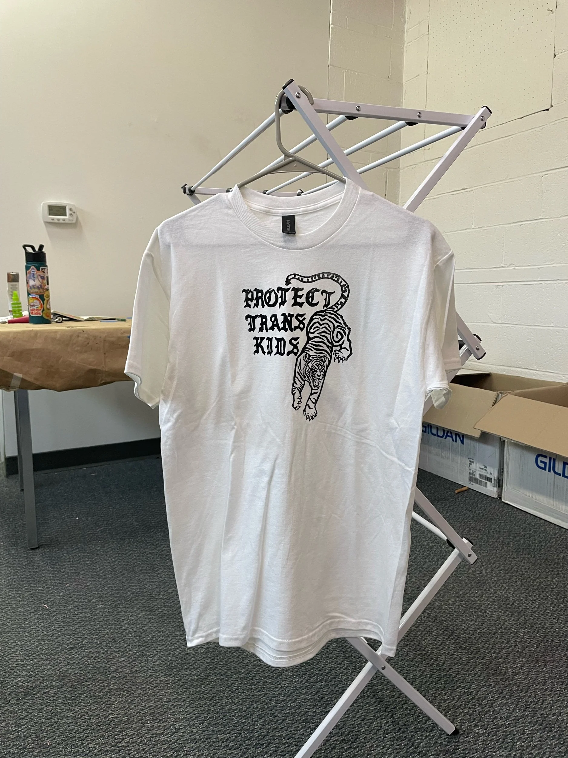 Hand carved and printed with long-lasting fabric ink on Gildan shirts. Trad tattoo inspired Tiger with the message “Protect Trans Kids”! Prints subject to minor defects and inconsistencies as shown in photos, usually lines from the block or sections of the print can be slightly faded or smudged. Shirts are non returnable. Please message me @milesmadonna_ on Instagram for any questions about sizing, shipping, etc.