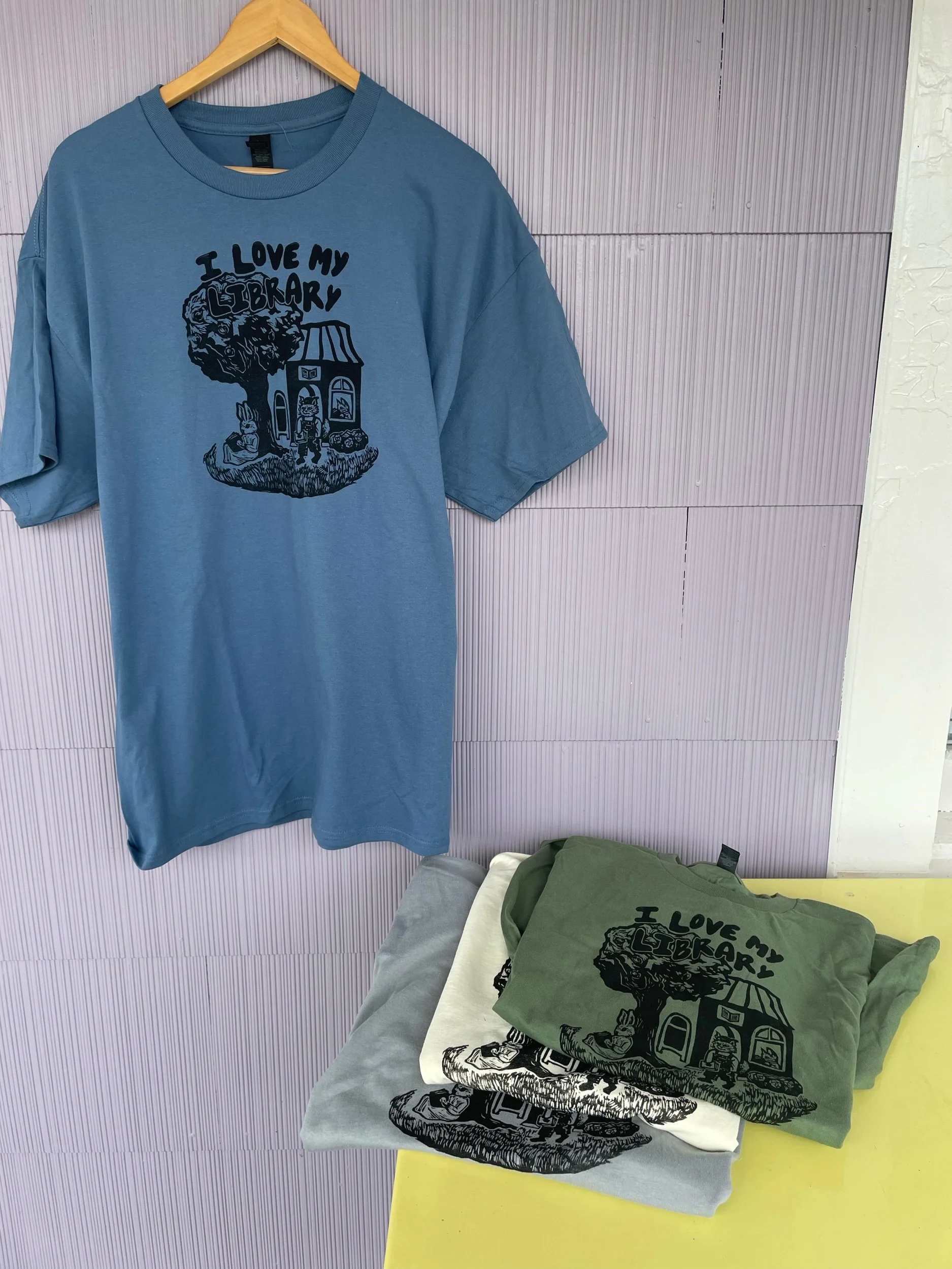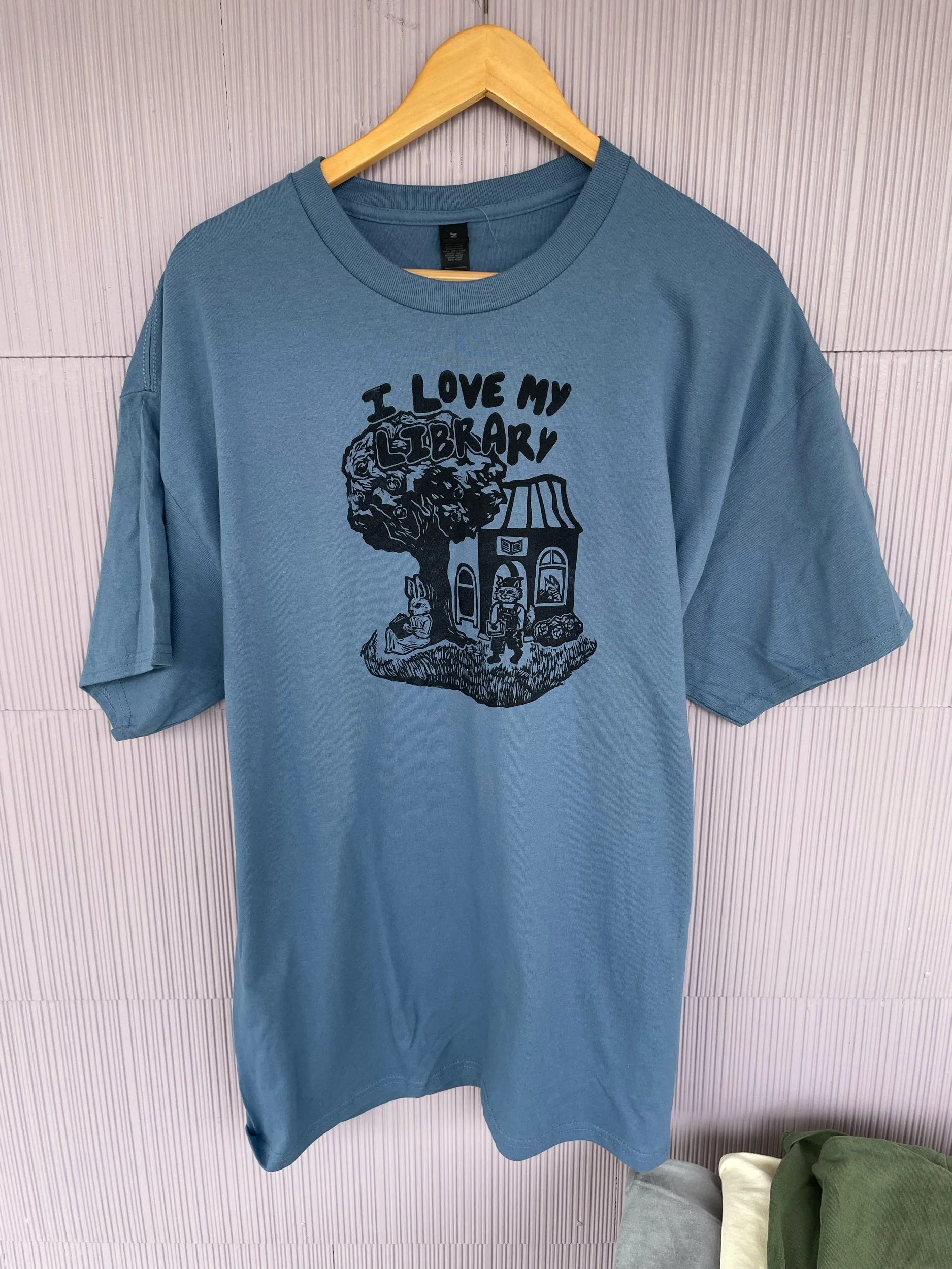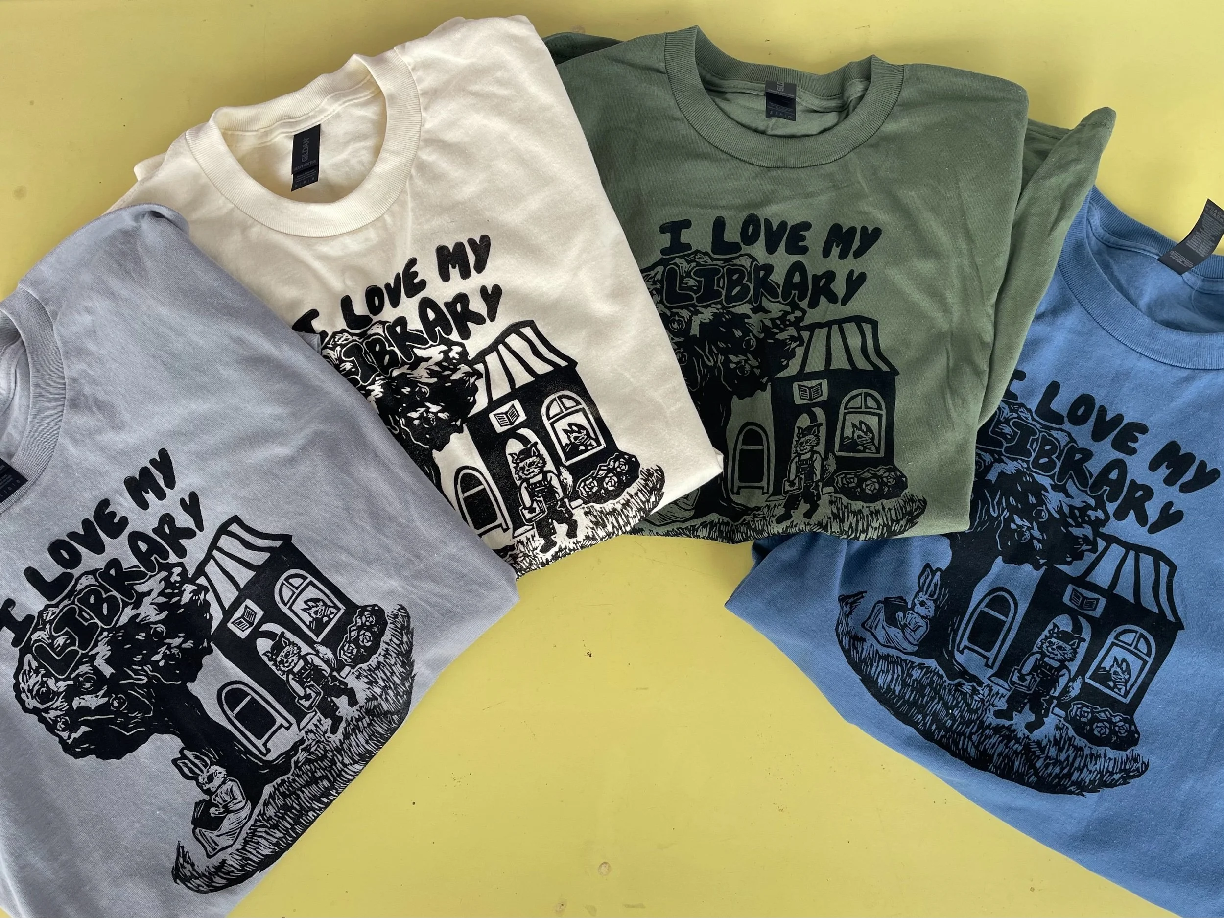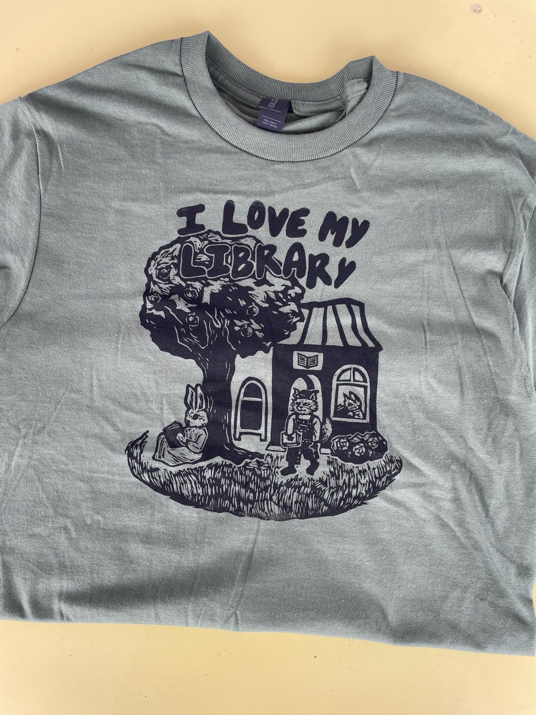 Hand carved illustration of a cute community of animals supporting their local library. Printed on Gildan shirts with long-lasting fabric ink. Prints subject to minor defects and inconsistencies as shown in photos, usually lines from the block or sections of the print can be slightly faded or smudged. Shirts are non returnable. Please message me @milesmadonna_ on Instagram for any questions about sizing, shipping, etc.