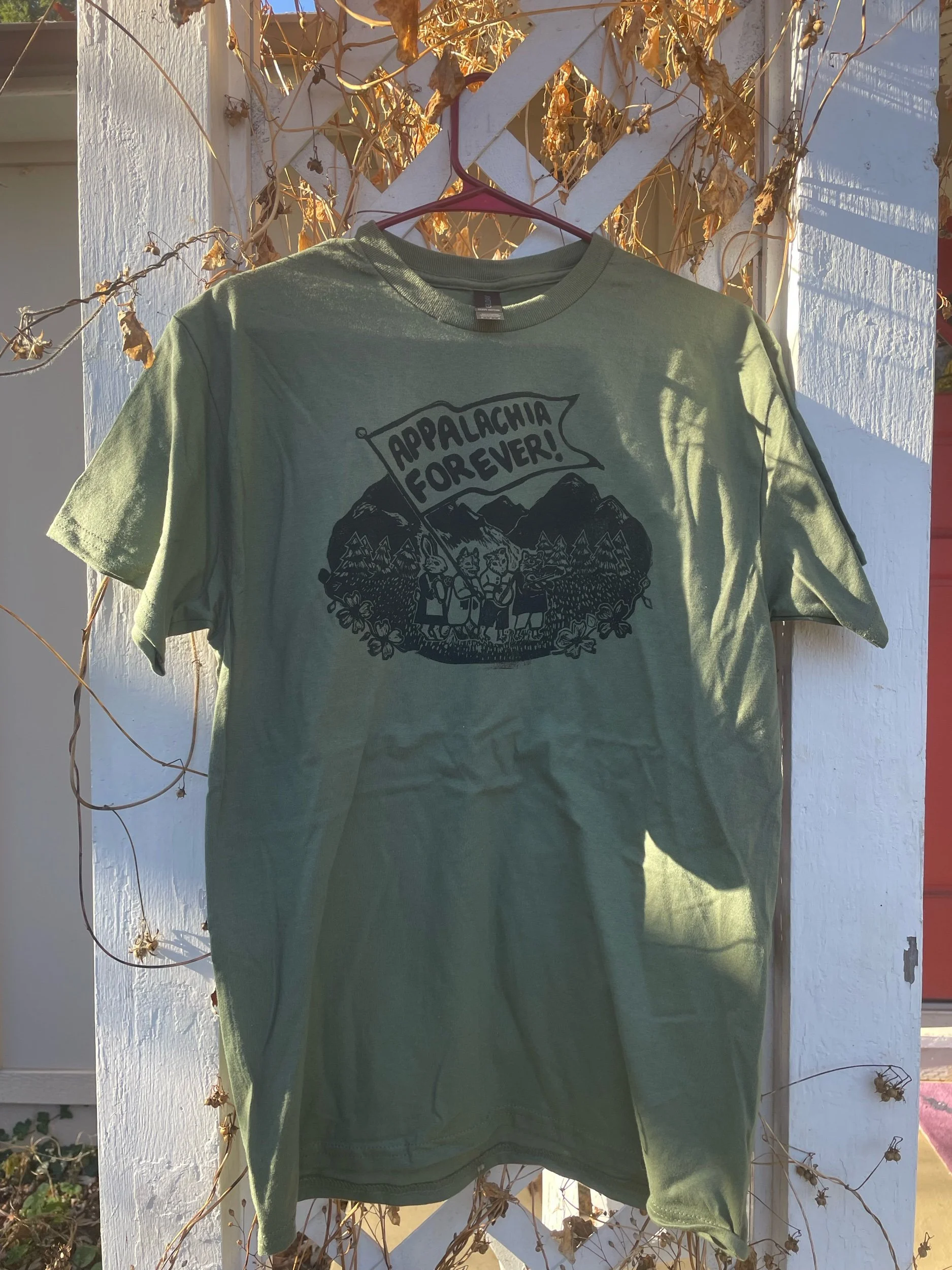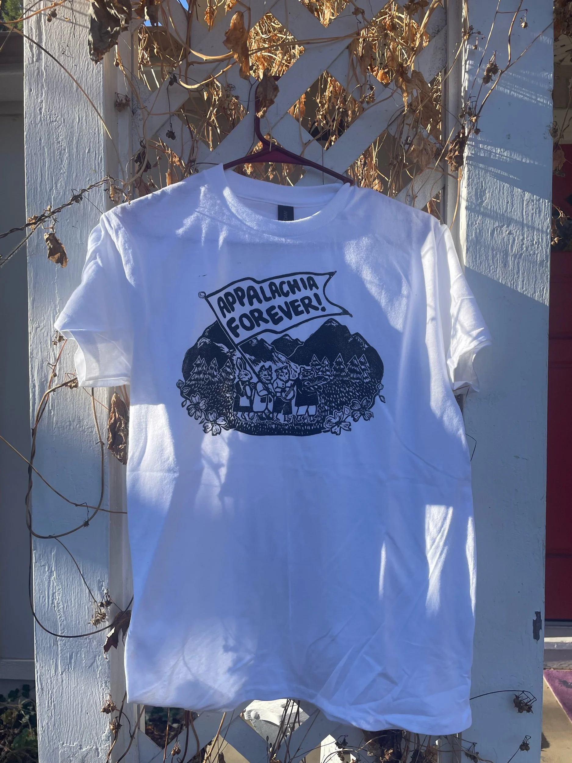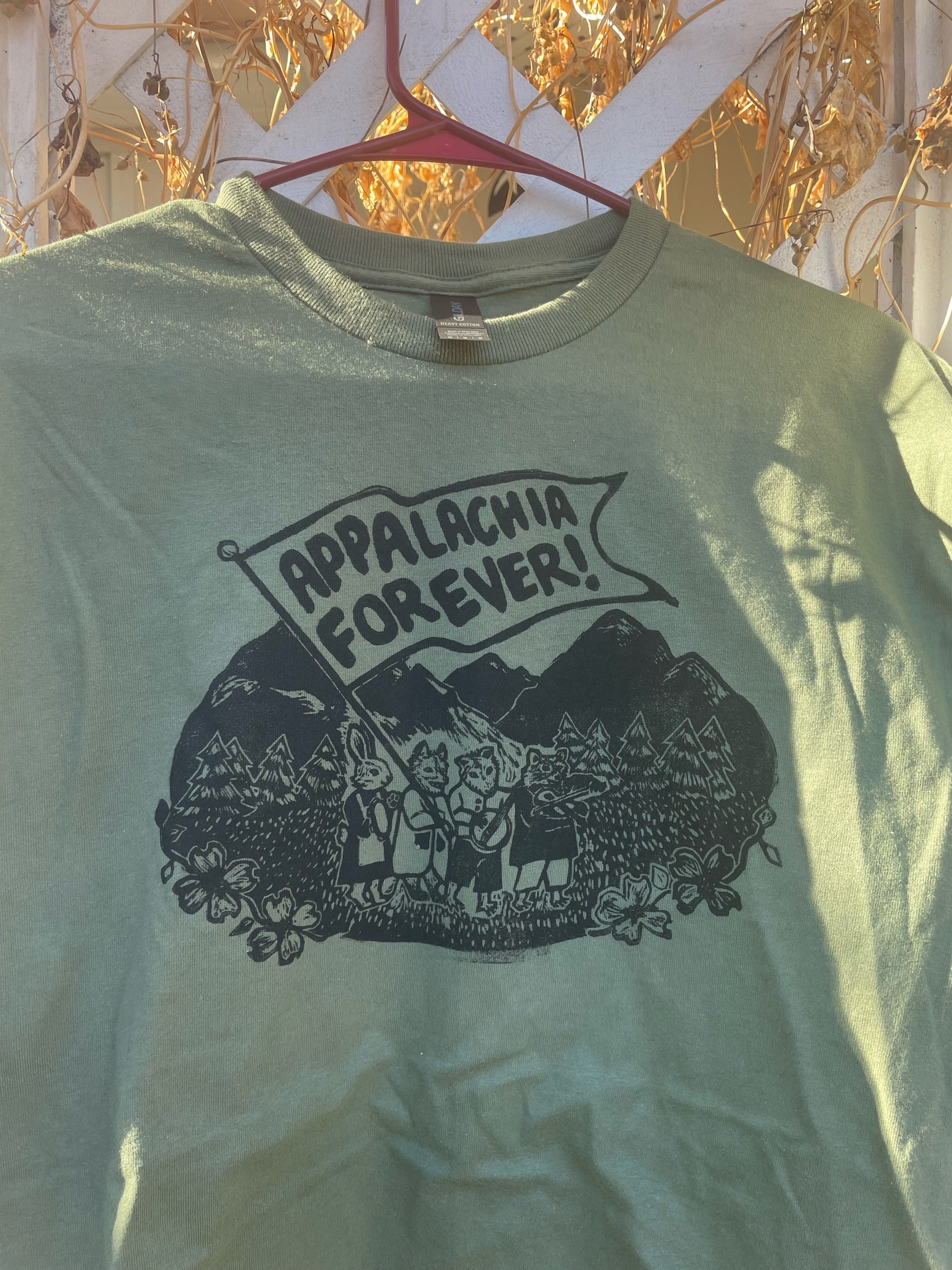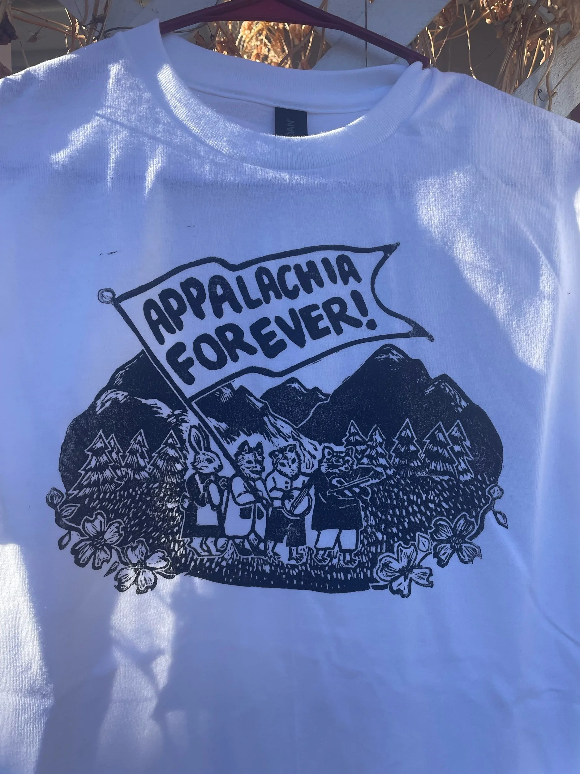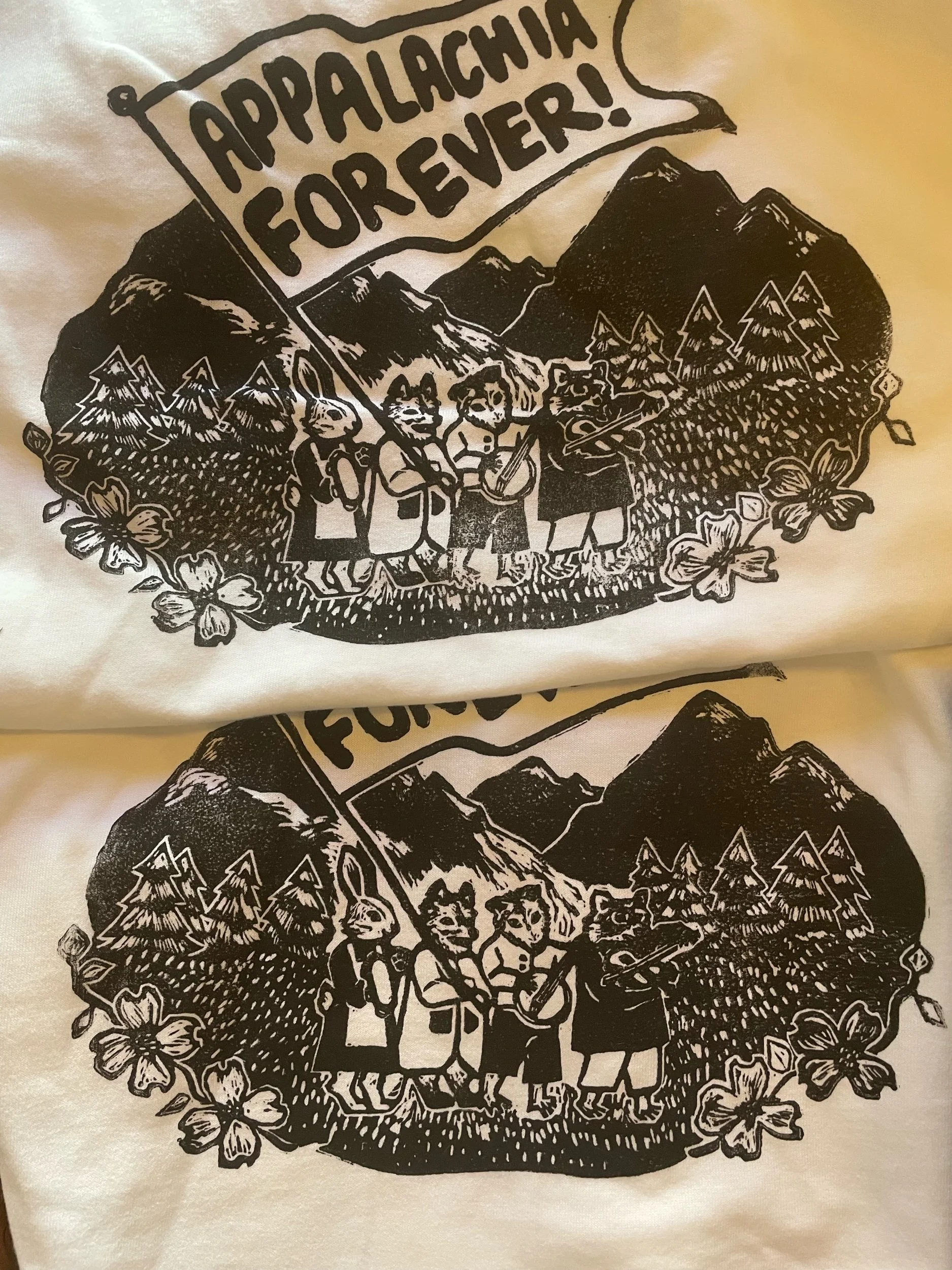 Hand carved and printed with long-lasting fabric ink on Gildan shirts. A merry band of woodland creatures make their way through town, playing music and cheering, “Appalachia Forever!” Prints subject to minor defects and inconsistencies as shown in photos, usually lines from the block or sections of the print can be slightly faded or smudged. Shirts are non returnable. Please message me @milesmadonna_ on Instagram for any questions about sizing, shipping, etc.